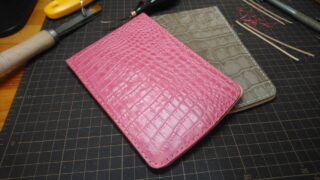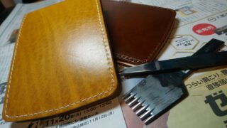 お知らせ 本革製スコアカードホルダー、クロコ型押しバージョン制作 スコアカードホルダー制作し出品しました。今回は山羊革のクロコ型押し革で制作しました。今回使ったや革は非常に柔らかいので芯を固めのものを使いました。スコアカード記入時はしっかりとした硬さを保ちながら開閉は柔らかい革のおかげで非常にスムースです... 2018.10.04 お知らせスコアカードホルダー