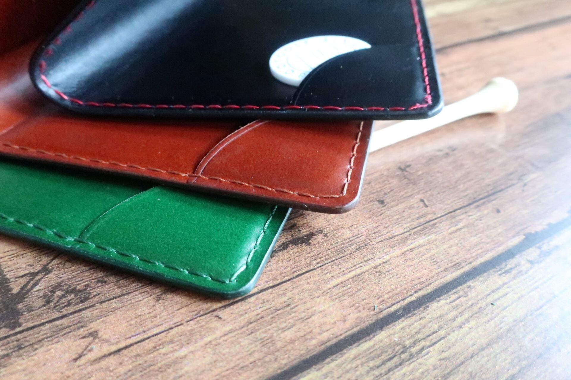 以前は黒革に緑のステッチでオーダーがありましたが、黒革ですと黄色や水色のステッチもかっこいいですよ。