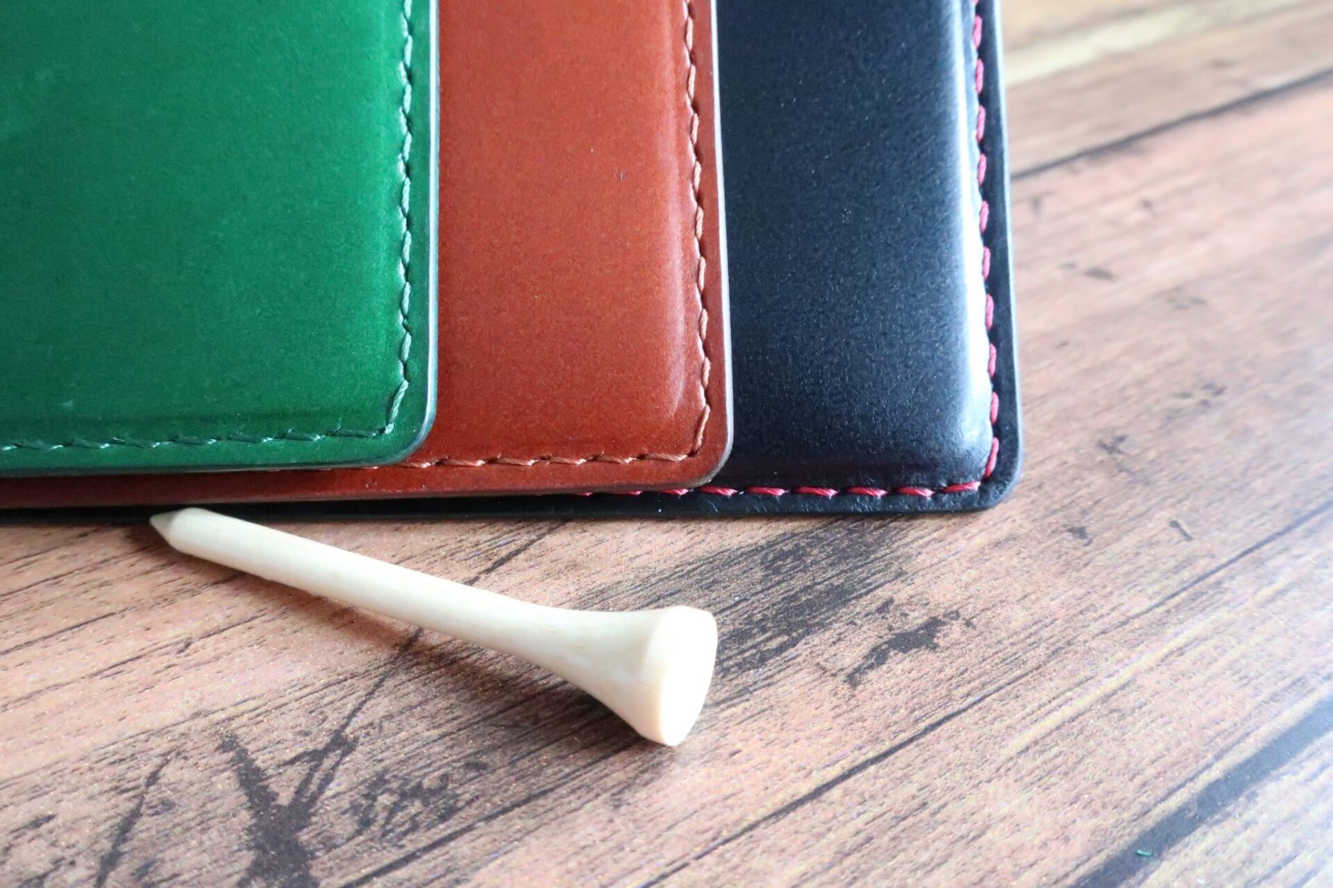黒革×黒ステッチ、黒革×赤ステッチ、緑革×緑ステッチ、緑革×白ステッチ、茶革×茶ステッチ、茶革×茶ステッチそれぞれ1つづつ制作しました。